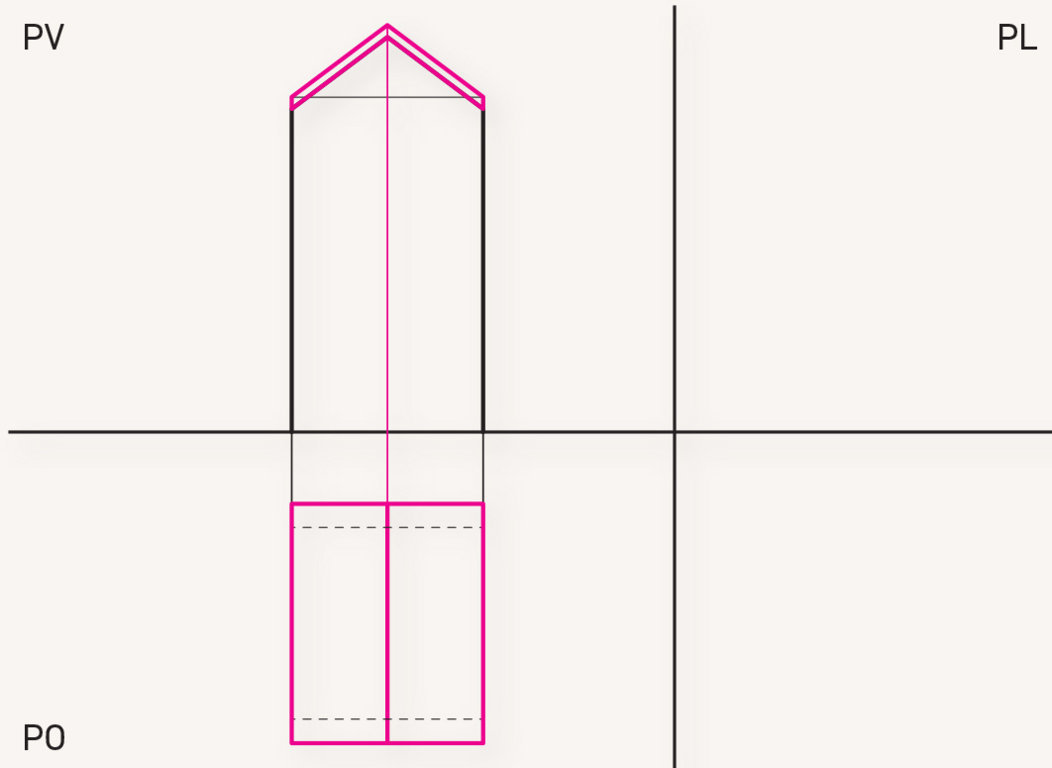 2. Dal punto medio della base superiore tracciare un segmento di 1,5 cm: si troverà il colmo del tetto. Congiungere questo punto con i due vertici superiori del rettangolo per completare il prospetto.